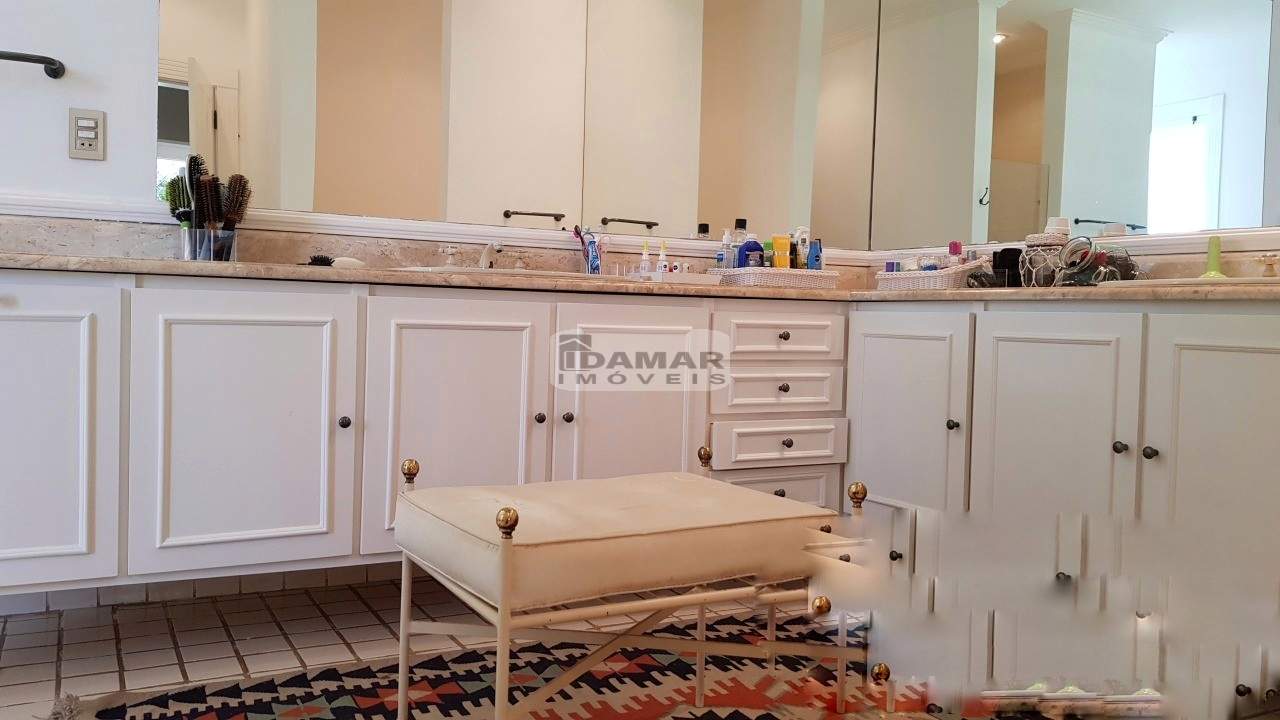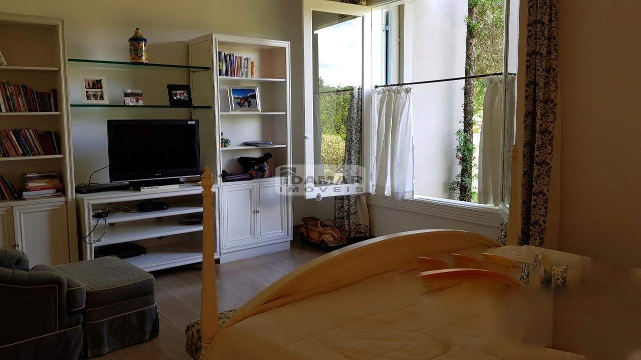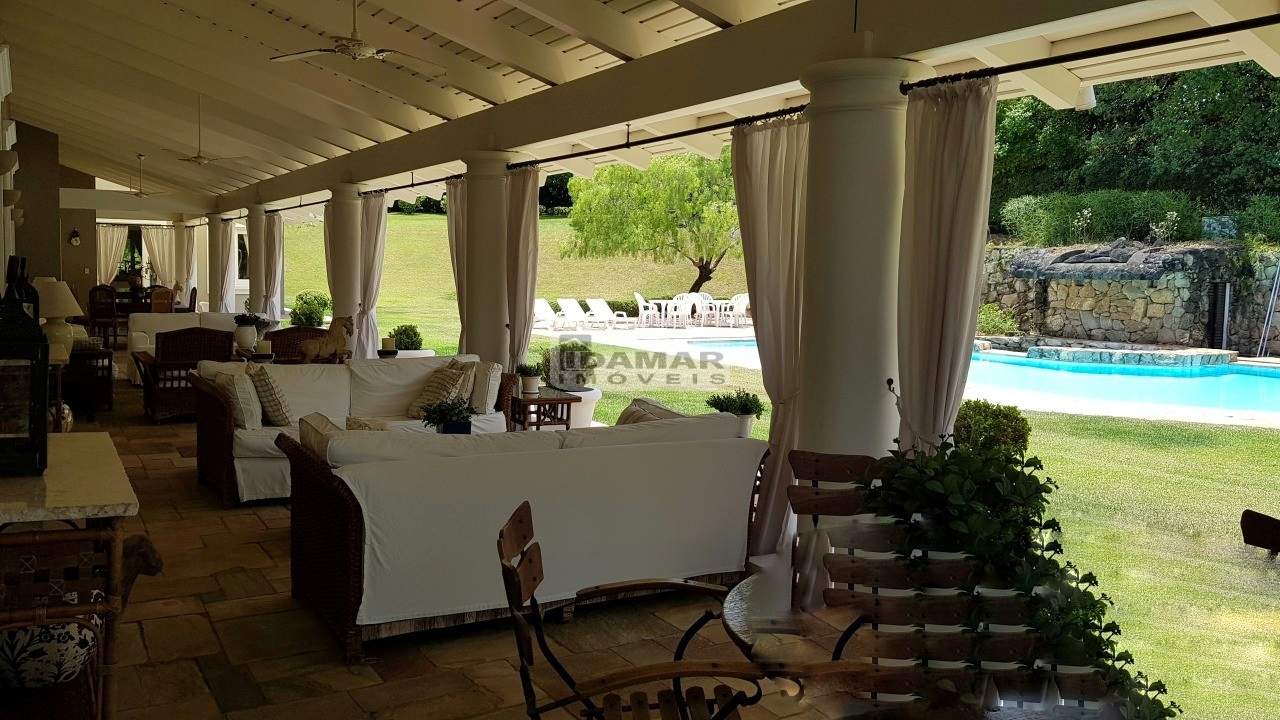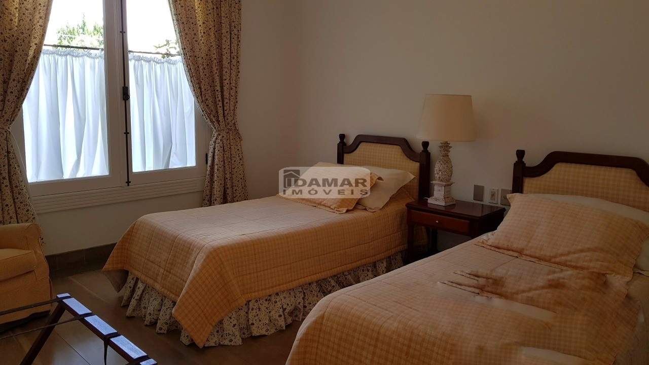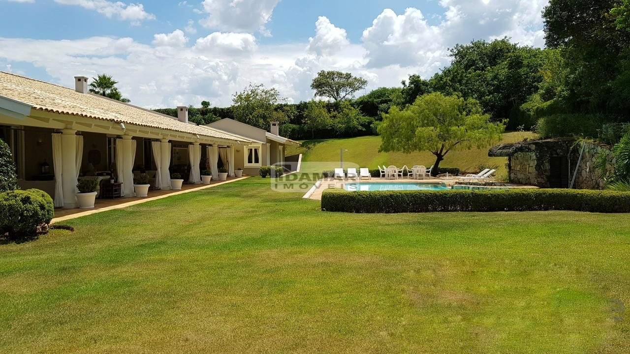 Casa térrea, com 5 suítes, 6 banheiros e 2 vagas de garagem. Excelente localização e ares de uma fazenda requintada. Bem distribuída em seus 2 lotes. Com poço artesiano e integração com o jardim clássico. Piscina posicionada no centro dos lotes. Em uma rua de pouco movimento no meio do condomínio. Possui casa de caseiro com 2 quartos, sala, cozinha e banheiro.