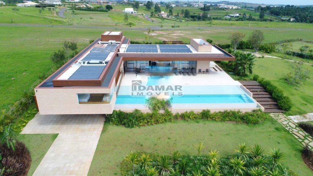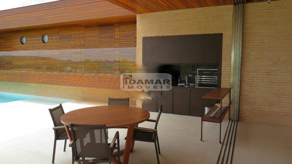 Área externa com extenso quintal gramado, espaço gourmet com churrasqueira, piscina com prainha, spa, fire pit, paisagismo deslumbrante e garagem para 6 carros.