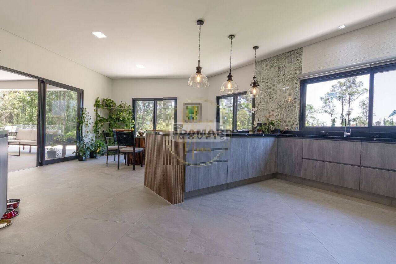 COZINHA COM SALA DE ALMOÇO E ESPAÇO GOURMET COMPLETO COM LINDA VISTA PARA A PISCINA E ÁREA VERDE.