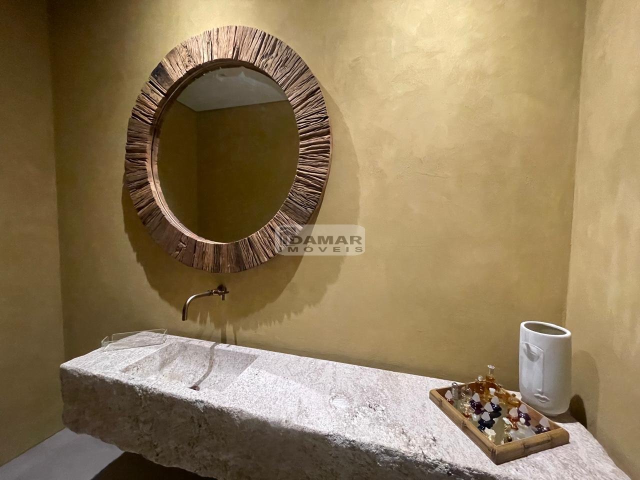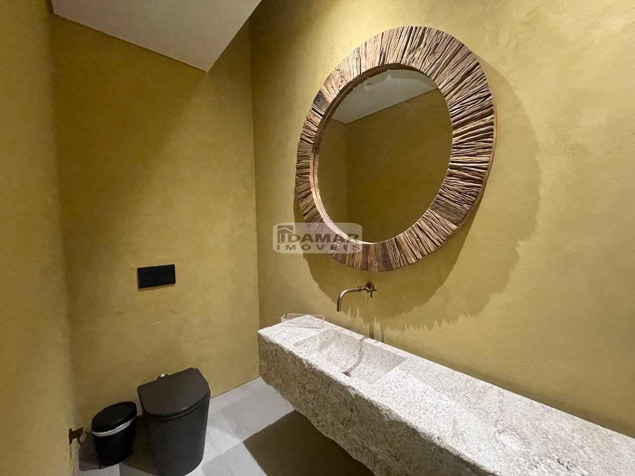 Estrutura de Automação Vídeo e Som Foneplan, Pedra Moledo na fachada e parte da área social, Projeto de decoração da Siena Interiores, Piso da área social Porcelanato Italiano Refin Desing Industry Raw Light, Lavabo pintura Artesanal da Passalaqua e Bancada Pedra rústica Esculpida, Piso e Forros Cumaru