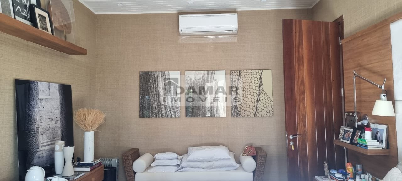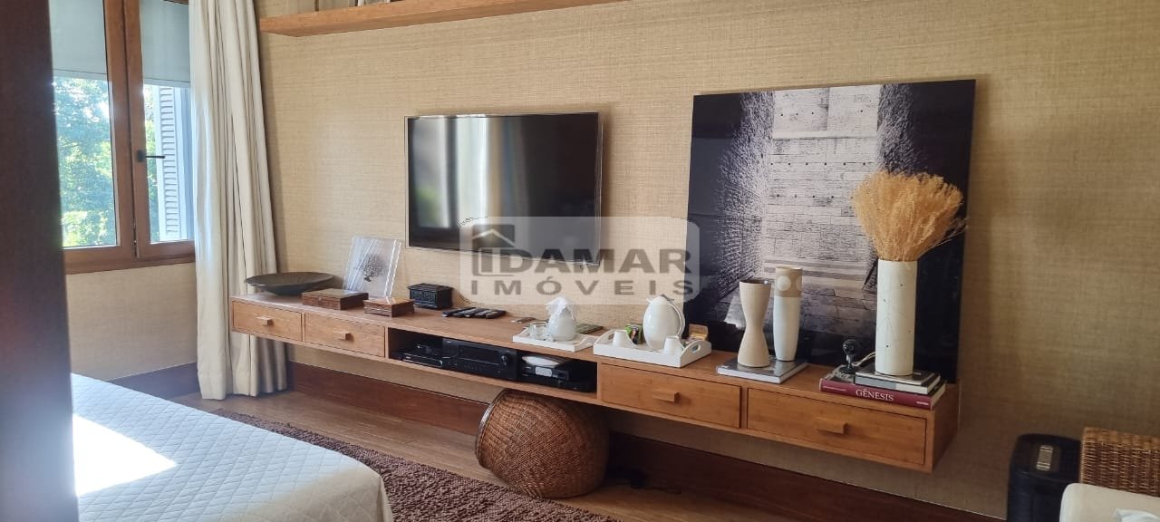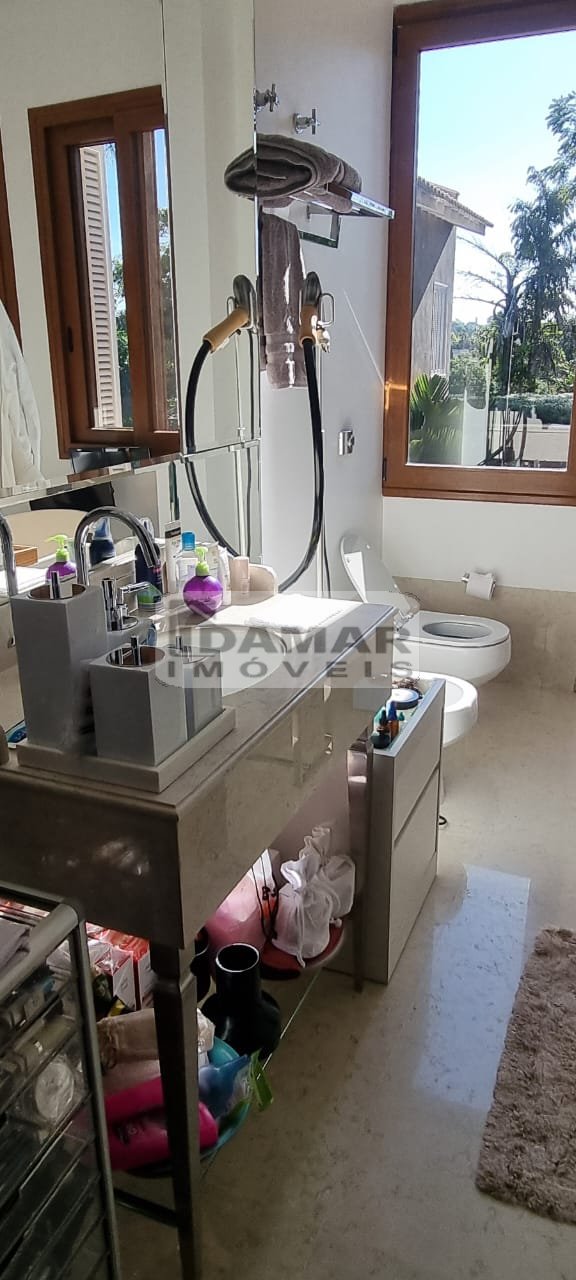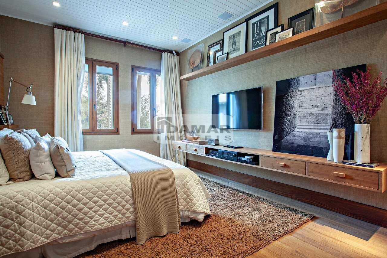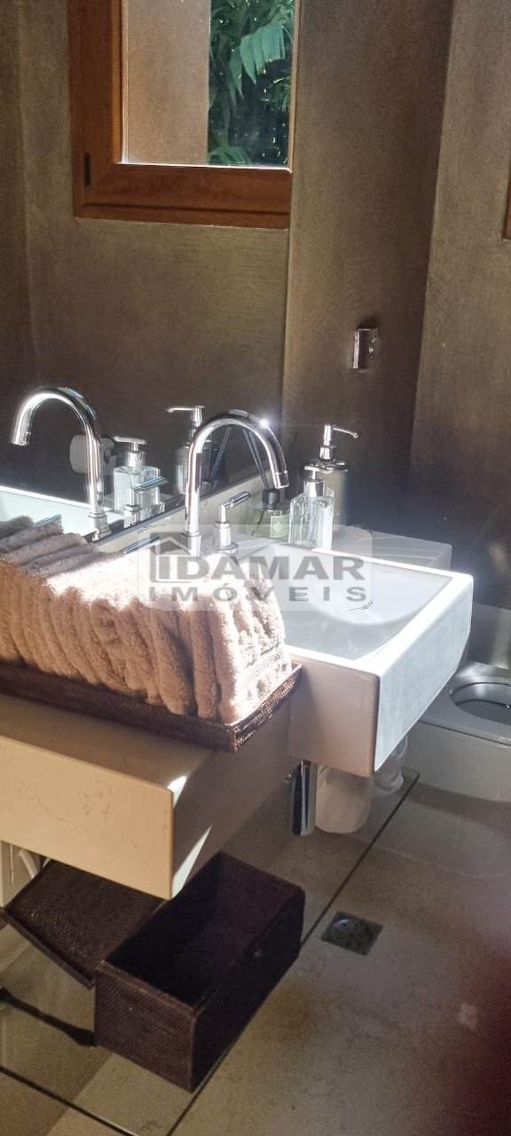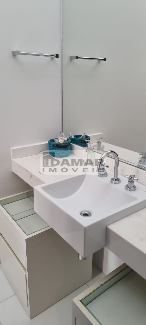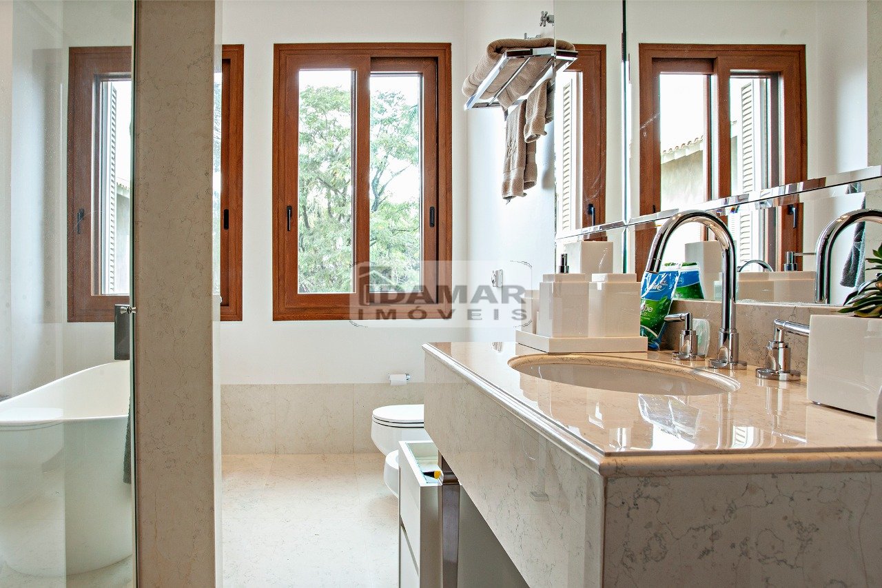 Suíte Master com sala íntima e banheiro duplo com banheira de hidromassagem. Todos os banheiros em mármore nobre. Janelas em PVC alemão, imitando madeira nobre com total isolamento acústico.