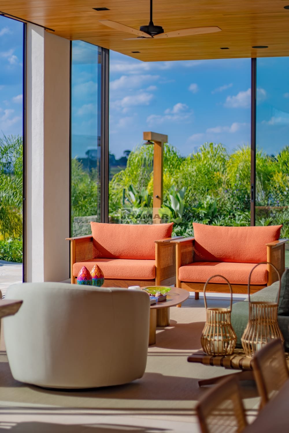 Salas com forro de madeira e piso porcelanato da Portinari
