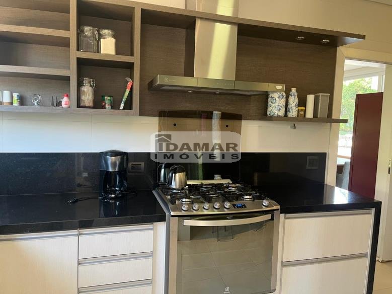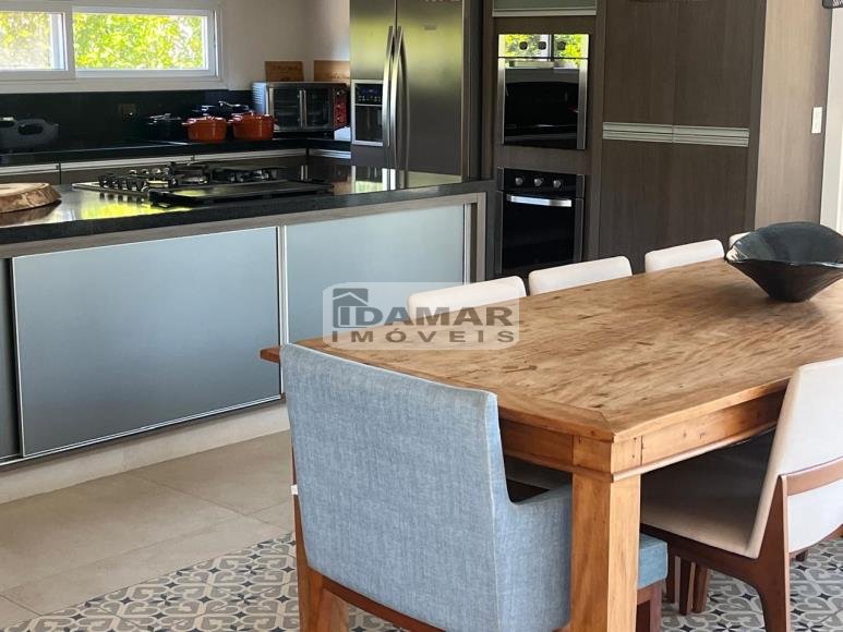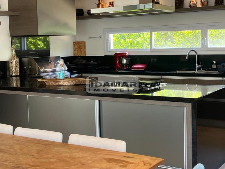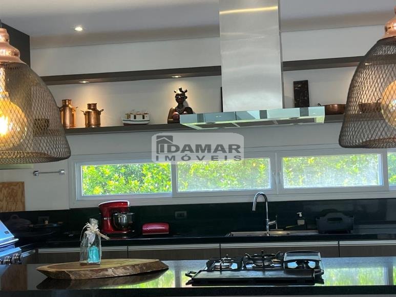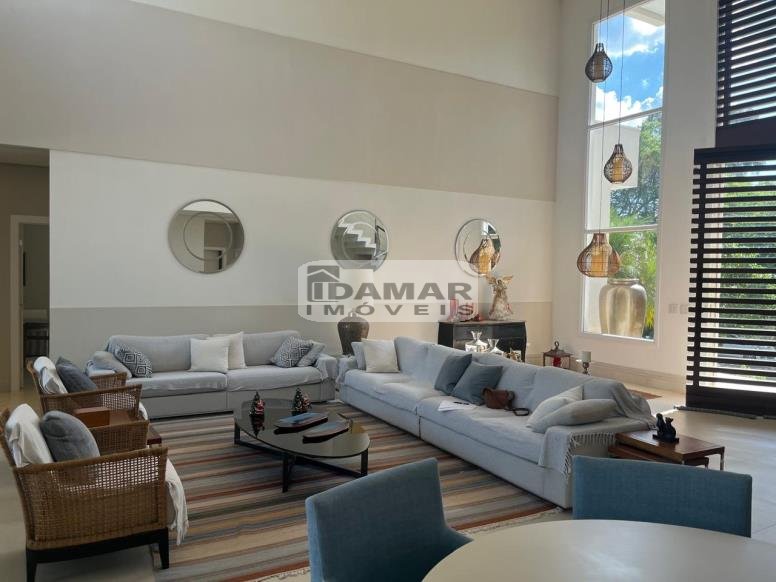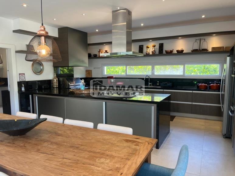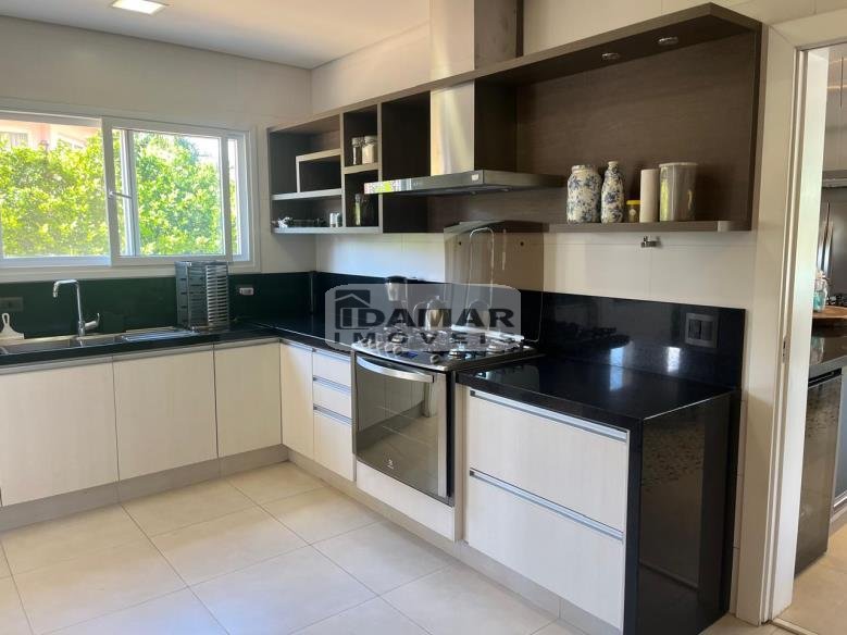 Pavimento Térreo: Garagem coberta para 3 carros. Ampla sala de estar conjugada com jantar e varanda, com pé direito duplo. Home Theater. 3 Suítes com Closet. Lavabo. Área serviço. Ampla cozinha com despensa, integrada com espaço gourmet. Espaço gourmet amplo e super equipado. Sala de musica. Vestiário. Quarto funcionária. Banheiro serviço. Depósito.